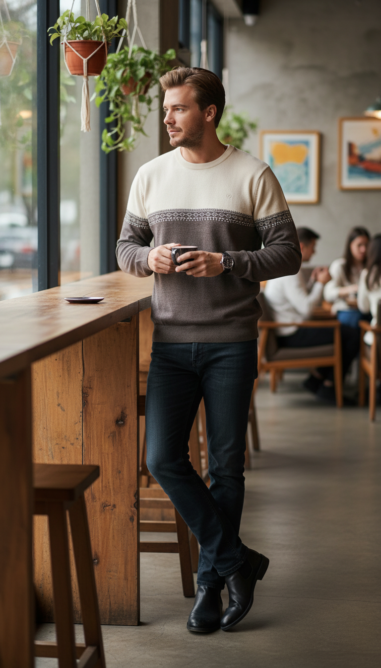 - Áo len nam cổ tròn basic kết hợp với quần jeans.