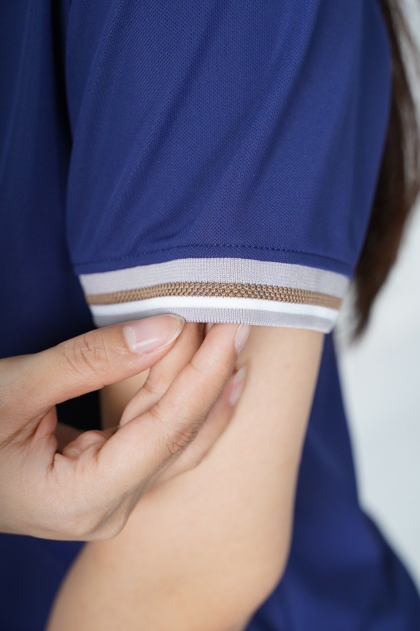 - Bo cổ, bo tay dệt dày dặn, giữ phom tốt, co giãn không bai gião