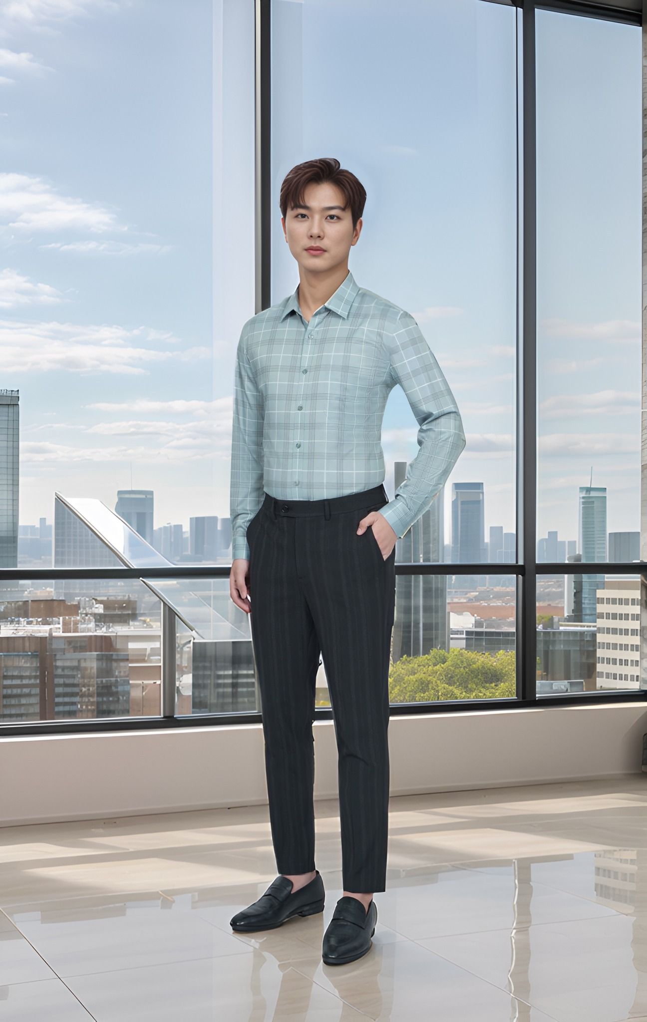 - Nổi bật với họa tiết phối màu kẻ caro tone xanh ghi, hài hòa, trẻ trung, lịch lãm